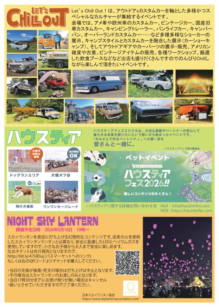 Let’s Chill Out!は、アウトドアxカスタムカーを軸とした多様かつスペシャルなカルチャーが集結するイベントです。